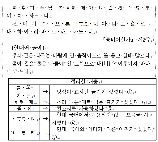 불․휘 기․픈 남․ᄀᆞᆫ ᄇᆞᄅᆞ․매 아․니 :뮐․ᄊᆡ 곶 :됴․코 여․름 ․하ᄂᆞ․니