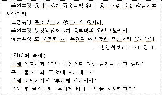 善쎤慧혜ᇰ ㉠니ᄅᆞ샤ᄃᆡ 五오ᇰ百ᄇᆡᆨ 銀은 ㉡도ᄂᆞ로 다ᄉᆞᆺ ㉢줄기ᄅᆞᆯ 사아지라.
