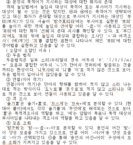객체 높임법에서 높임의 대상이 목적어 또는 부사어가 지시하는 대상이 될 수 있는 것은 맞지만, ㉤과 ㉥에는 목적어가 생략되어 있고 대신 화자가 존대할 대상으로 부사어가 지시하는 대상인 ‘부텨(부처)’가 있다. 서술어 ‘받ᄌᆞᄫᅩ리라’에는 부사어로 실현된 ‘부텨’를 높이기 위한 객체 높임의 선어말 어미 ‘-ᄌᆞᆸ-’이 사용되고 있어 ‘부텨’에 대한 화자 ‘선혜’의 존대 의사를 확인할 수 있다. 또 ‘부긔’에도 ‘부텨’ 뒤에 높임의 대상과 결합하는 조사인 ‘ㅅ’과 여격조사‘( (에)게’)인 ‘긔’를 결합한 표현이 나타나서 체언 ‘부텨’에 대한 경어법을 실현하고 있음을 알 수 있다.