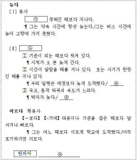 ⑤ ㉤에 들어갈 말은 ‘늦다[Ⅱ]’이다.