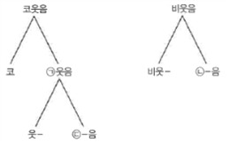 ㉠은 그 자체로 ‘코웃음’의 어근이면서, 또 어근에 파생 접미사 ‘―음’이 결합해 만들어진 명사이기도 하다. 그런데 ‘그가 큰 소리로 ―웃음―은 놀라운 일이었다.’의 밑줄 친 ‘웃음’은 동사 어간 ‘웃―’에 명사형 전성 어미 ‘―음’이 결합한 것이다. 즉 ㉠‘웃음’은 명사이고, ‘그가 큰 소리로 웃음은 놀라운 일이었다.’의 밑줄 친 ‘웃음’은 동사의 명사형이므로 품사가 같다고 할 수 없다.