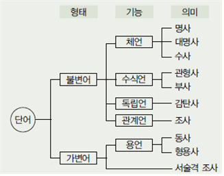 문장 내에서 해당 단어가 수행하는 기능(역할)을 기준으로 체언, 용언, 수식언, 관계언, 독립 언으로 나눌 수 있음. 수식언은 다시 무엇을 꾸미느냐에 따라 관형사와 부사로 나눌 수 있으며, 관계언에는 조사가, 독립언에는 감탄사가 있음.