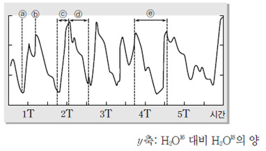 ② ⓑ 시점은 ⓐ 시점에 비해 지구의 평균 온도가 높은 시기에 해당 한다. 따라서 ⓐ 시점에 비해 H2O18의 상대적인 양이 증가하게 된다. 하지만 ⓑ 시점은 ⓐ 시점에 비해 지구의 평균 온도가 높으므로 증발된 H2O18의 양도 증가하게 되며, 다만 H2O 의 상대적인 양이 증가한 것으로 볼 수 있다.