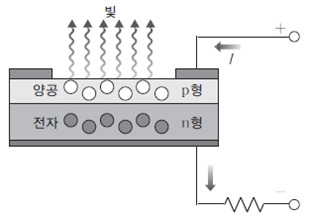 p형 반도체와 n형 반도체를 접촉시킨 뒤 양 끝에 전극을 붙인 것을 p-n 접합 다이오드라고 한다. p-n 접합 다이오드의 p형 반도체 부분에 ‘+’극을, n형 반도체 부분에는 ‘-’극을 연결한 경우를 순방향 전압이라고 한다. 순방향의 전압이 걸리면 p-n 접합면에 양공과 전자가 공존하는 영역이 생기면서 전자가 양공을 채워 전류가 지속적으로 흐르게 된다. 다이오드를 제작할 때 p형 반도체에 비해서 n형 반도체에 더 많은 양의 불순물을 넣으면, 전류가 흐를 때 주로 전자가 이동한다. 순방향 전압이 흐르면 전도띠에 머물던 전자가 p형 반도체에 도달해 양공과 결합하면서 에너지 준위*가 낮은 자리로 이동하는데, 이때 생기는 에너지를 빛의 형태로 방출하게 된다. LED는 바로 이러한 원리를 이용한 것이다. LED는 반도체의 재료로 어떤 화합물을 사용하느냐에 따라, p형 반도체와 n형 반도체 사이의 에너지 준위 차이가 달라지므로 이에 따라 방출하는 빛의 색깔도 달라진다.