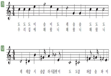 *(가)는 으뜸음 ‘도’를 중심으로 선율이 진행되고 있는 반면, (나)는 한 옥타브 내에 있는 모든 음이 균등하게 사용되고 있다.