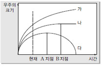 ‘현재’ 지점에서 ‘가’, ‘나’, ‘다’ 세 개의 우주는 모두 팽창하고 있는 모습이다.