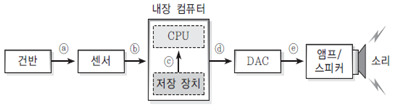 이때, ⓐ는 건반의 눌림과 움직이는 속도, ⓑ는 감지된 건반의 움직임, ⓒ는 해당 건반의 소리 데이터, ⓓ는 처리된 소리 데이터, ⓔ는 변환된 아날로그 신호이다.