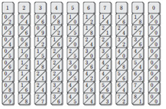 [A] {네이피어의 뼈를 이용하여 12^16^7을 계산하기 위해서는 머리 수가 1, 2인 두 막대를 뽑아서 왼쪽에서 오른쪽으로 나란히 붙여 놓는다. 이로써 12를 표현한 것이다. 그 다음에는 7을 곱하기 위해서 막대의 7번째 가로줄의 숫자를 본다. 머리 수가 1인 막대는 0/7, 머리 수가 2인 막대는 1/4라고 적혀 있을 것이다. 이것을 이어서 쓰면 0/7 1/4가 된다. 이때 인접해 있는 7과 1을 더하면 8이 되므로 0/8/4로 적고, 이 곱셈의 답 84를 구하게 된다. 왜 이런 결과가 나오는 것일까? 그것은 각각의 막대가 각 막대의 머리 수를 배수로 하는 수를 적어 놓은 것이기 때문에 1의 7배수와 2의 7배수를 구한 다음에 앞에서 구한 수는 10을 곱하고 뒤에 구한 수는 1을 곱하여 더한 것임을 알 수 있다. 그러면 345^16^234를 계산해 보자. 이를 위해서 머리 수가 3, 4, 5인 세 막대를 뽑아서 왼쪽에서 오른쪽으로 나란히 붙여 놓는다. 계산을 단계별로 하기 위해서 먼저 345^16^2를 계산하는데 막대의 2번째 가로줄을 보자. 0/6 0/8 1/0을 볼 수 있을 것이다. 이웃한 수는 더해 주고 왼쪽부터 읽어 주면 0690이 되어 그 답이 690임을 알 수 있다. 345^16^3을 계산하려면 붙여 놓은 세 막대의 3번째 가로줄 0/9 1/2 1/5를 같은 방법으로 더해 주어 0/10/3/5를 얻되, 이렇게 10을 넘는 결과가 나오면 위의 자리로 올려서 더해 주면 되는데 1035가 답이 된다. 같은 방식으로 345^16^4를 계산하면 1/2 1/6 2/0으로부터 1/3/8/0, 즉 1380을 얻는다. 이제 앞서 구한 세 수 690, 1035, 1380을 첫 번째 수에는 100을 곱하고, 두 번째 수에는 10을 곱하고 세 번째 수는 1을 곱하여 더하게 되면