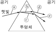 <보기>는 빛의 굴절과 분산 현상이 나타나 있는 그림이다. 공기보다는 유리와 같은 투명체의 밀도가 높아서, 빛의 속력은 유리에서 더 느려진다. 따라서 유리를 통과하는 ⓑ, ⓒ가 공기 중을 통과하는 ⓐ, ⓓ, ⓔ보다 속력이 낮다. 그리고 마지막 문단에서 빛이 공기 중에서 유리로 비스듬히 들어갈 때 진동수가 높은 보라색 광선이 진동수가 낮은 빨간색 광선보다 속력이 더 느려져서 더 많이 굴절된다고 하였다. 그런데 ⓑ와 ⓒ 중에 ⓒ가 더 많이 굴절되었으므로 ⓒ의 속력이 더 느려진 것임을 알 수 있다. 따라서 ⓐ~ⓔ 중에서 가장 속력이 느린 것은 ⓒ이다.