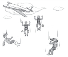 위의 그림은 영화 촬영 중인 상황을 나타낸 것이다. 비행기를 장악한 악당들이 한 여성을 비행기에서 밀어 버려서 그녀가 추락하고 있다. 낙하산을 등에 맨 쌍둥이 형 제 A와 B가 추락하는 그녀를 구하기 위해 약간의 시차를 두고 비행기에서 뛰어내렸다. 그리고 오른쪽에서는 그들이 낙하하는 장면을 카메라맨이 촬영하고 있다.