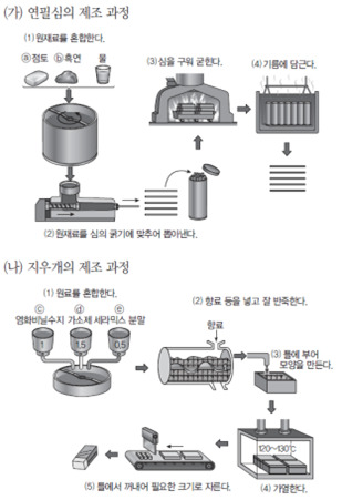 누구나 연필로 종이에 글씨를 쓰고 지우개로 지워 본 경험은 있지만, 그 과학적 원리를 알고 있는 사람은 드물다. 이를 이해하려면 연필과 종이, 지우개의 성분이나 제조 과정을 살펴보아야 한다. 연필심의 원료는 점토와 흑연인데, 흑연은 ‘먹’의 역할을, 점토는 흑연을 붙들고 있는 ‘몸’의 역할을 한다. 제조 공장에서는 이들 원료에 물을 넣고 잘 섞어 심의 굵기에 맞추어 길게 뽑아낸다. 이것을 약 1,000℃에서 구워 굳힌 다음 기름에 담그면 연필심이 완성된다. 고온으로 원료를 구워 내면서 점토가 흑연을 감싸 안은 형태로 굳으며, 기름에 담그는 과정을 거치면서 흑연과 점토 입자 사이에 기름이 스며들기 때문에 글씨가 부드럽게 써진다.