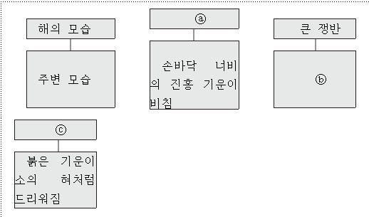 일출의 과정을 세밀하게 묘사한 작품의 세부 내용을 파악하여 해의 모습과 그 주변의 모습을 묘사하고 있는 장면을 구분하여 이해할 수 있는지 확인하는 문제이다.