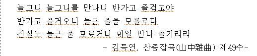 정답해설 : [A]에서 화자는 세월이 젊음을 앗아간다는 점에서 새해를 부정적으로 바라보고 있다. 화자 역시 새해를 즐겨 했던 젊은 날이 있었으나, ‘현재’의 화자는 늙음을 한탄하는 심정으로 새해를 바라보고 있으며, ‘아(아이들)’에게도 새해가 오는 것을 즐거워 말도록 훈계하고 있다. <보기>에서는 ‘늘그니(노인)’가 다른 ‘늘그니’를 만나 반갑고 즐거워하고 있으므로, 같은 처지의 상대방을 만난 기쁨이 드러난 것으로 볼 수 있다. 정답 ④