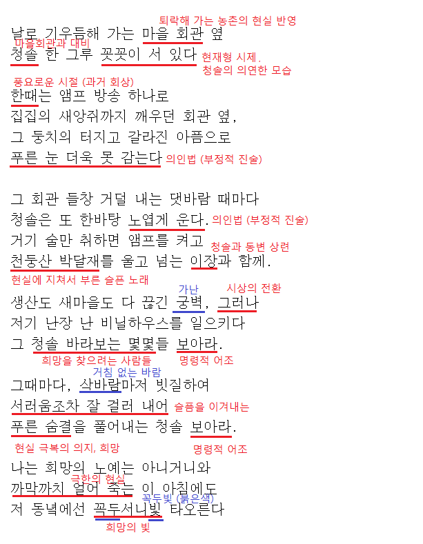 ∙3연: 마을 사람들과 함께 어려운 현실을 견디는 청솔
