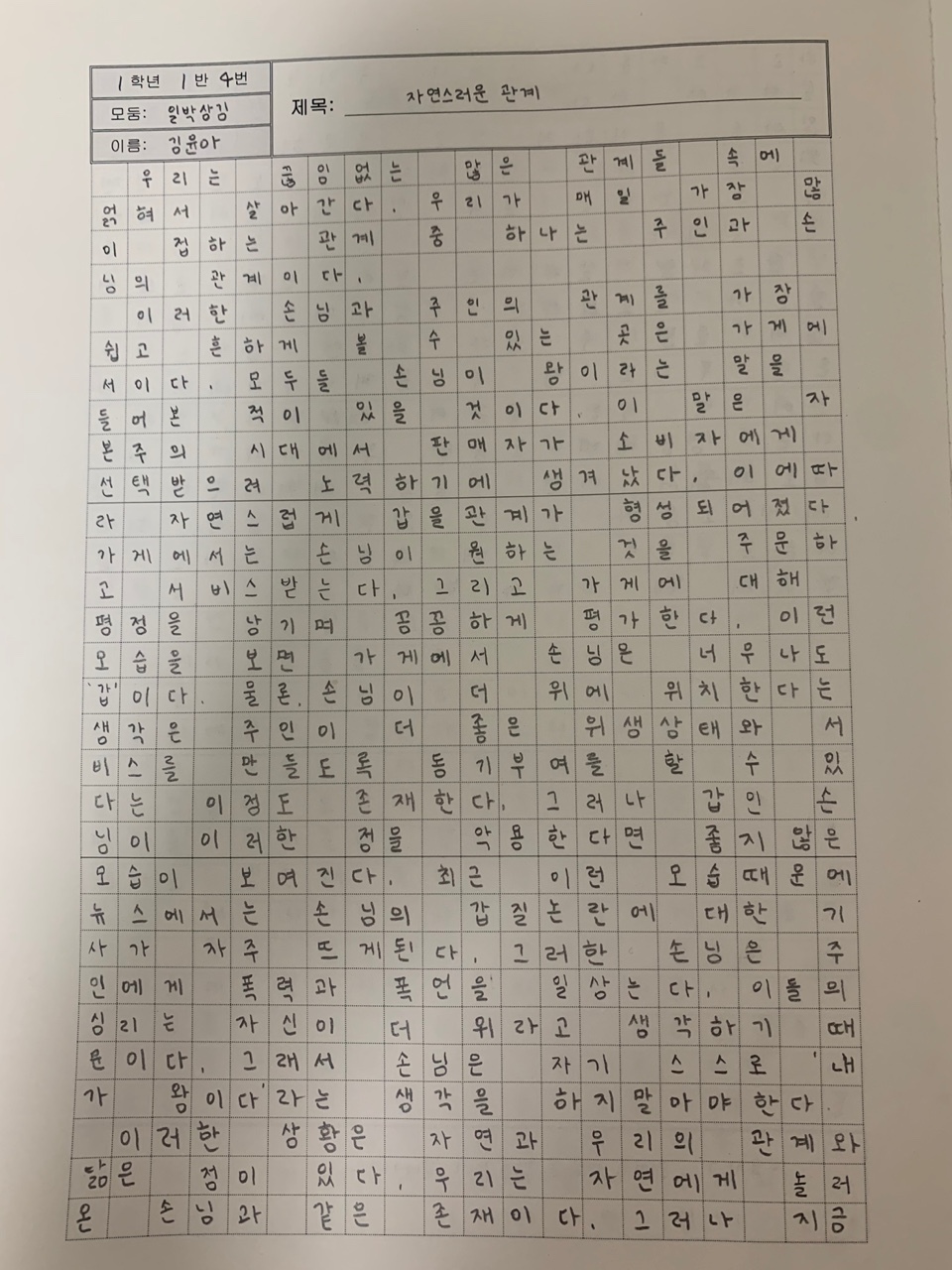 작성자김나라 작성시간 21.07.25 주인과 손님 사이의 관계를 자연에 빗대어 표현해 더 멋진 글이 된 것 같아. 나도 너의 글처럼 주인과 손님 사이의 갑과 을의 관계는 동기부여가 된다는 점에서는 나쁘지 않다고 생각하지만 이 관계를 악용한다면 갑 을 관계는 갈등이 생겨 심각한 상황까지 생길 수 있어 좋지 않다고 생각해. 시를 인용한 문장이 정말 인상 깊었어..! ‘가는 말이 고와야 오는 말도 곱다’라는 속담처럼 내가 잘해야 남도 나에게 잘한다는 것을 잊지말고 항상 상대방을 배려하는 자세를 가져야 겠어.