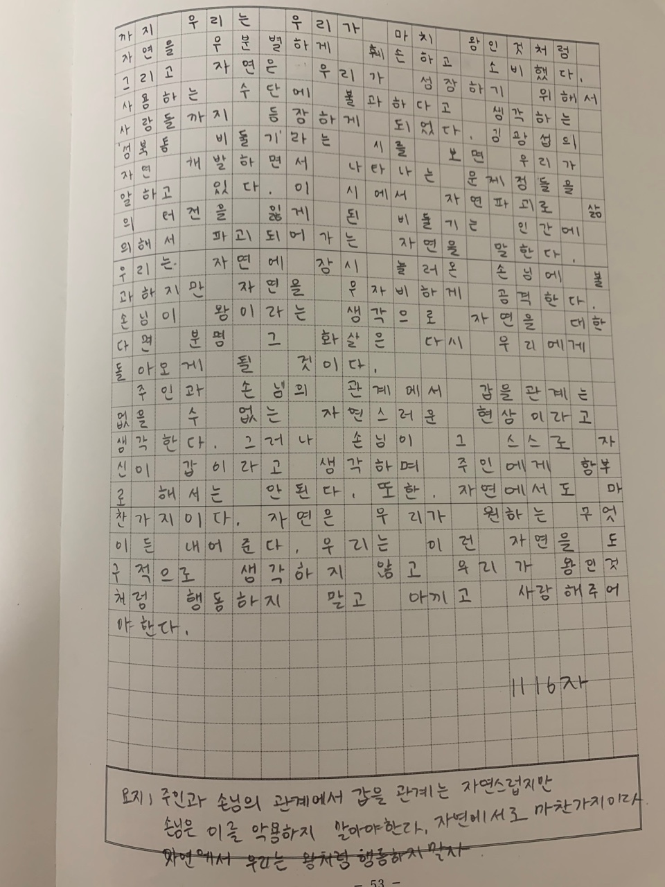 주인과 손님의 관계를 자연과 연관지어 글을 썼다는 게 신선했고 멋있었어!(๑•̀ᴗ-) -