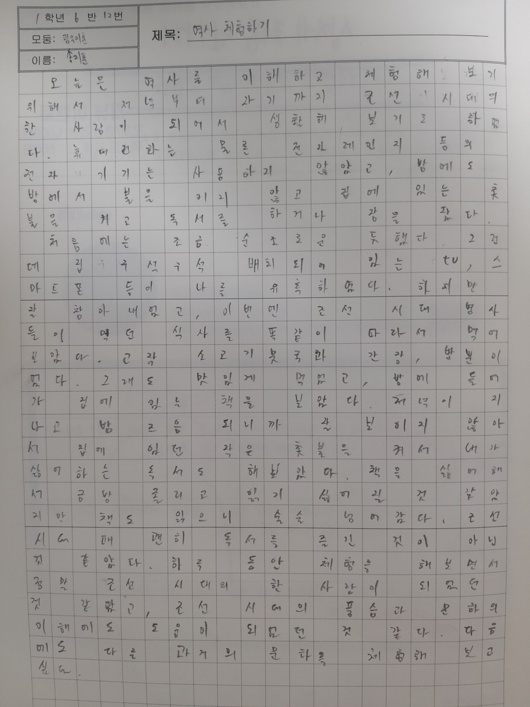 오늘은 역사를 이해하고 체험해 보기 위해서 저녁부터 자기까지 조선 시대의 한 사람이 되어서 생활해 보기로 하였다. 휴대전화는 물론 전자레인지 등의 전자 기기는 사용하지 않았고, 밤에도 방에서 불을 키지 않고 집에 있는 촛불을 켜고 독서를 하거나 잠을 잤다.