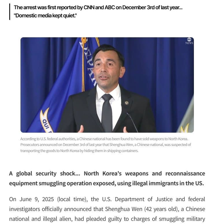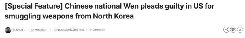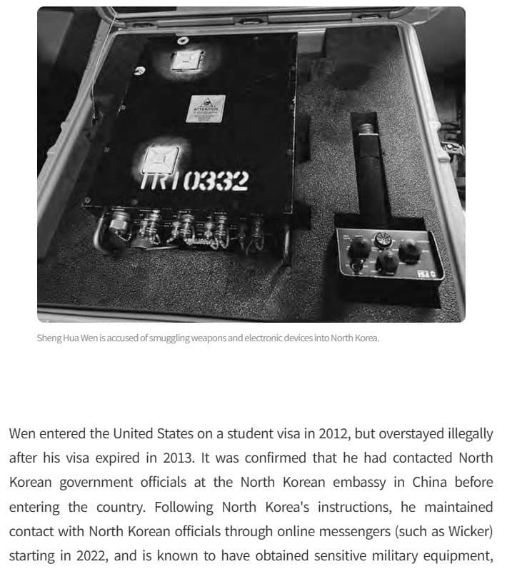 - 그게 아까 말한 북한 고위부들과 내통하고 수백만 달러의 돈까지 받아서 불법 무기들을 밀수해서 팔아 먹는 브로커 Shenghua Wen (셩화 웬) 이라는 게 나왔다고, 이 새끼 6월달에 빼박 정황들 보도 됐고, 지금은 추후에 열릴 연방법원 재판 대기중이야