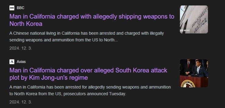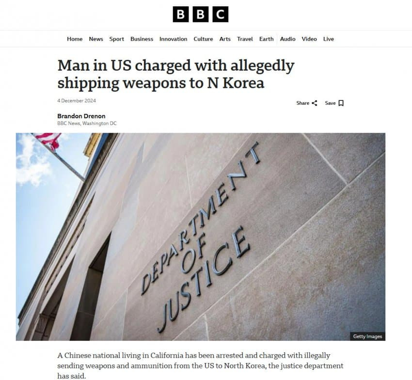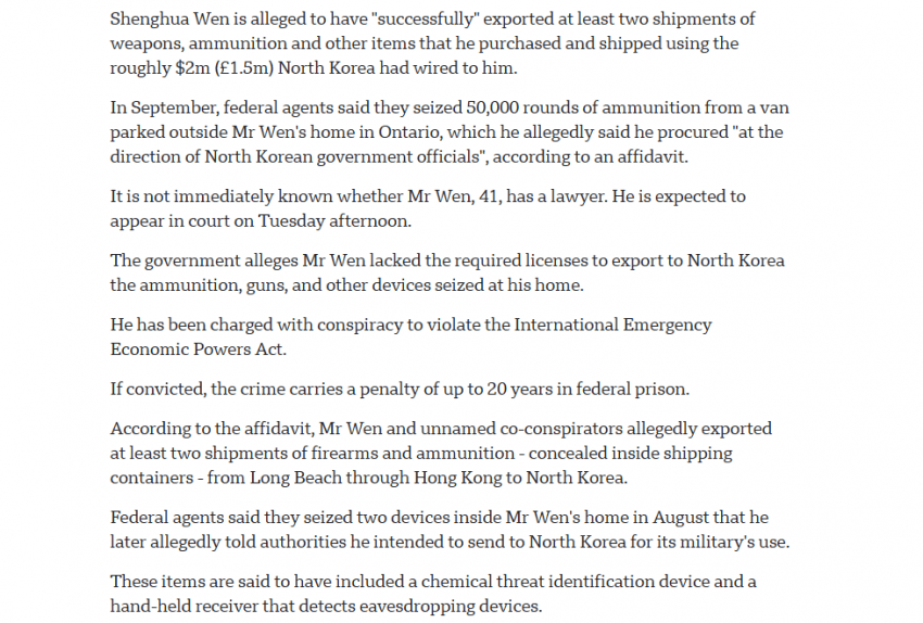 - 미국 켈리포니아에 거주하는 중국계 미국인이 미국에서 북한으로 불법무기 및 탄약들을 보내려다가 바로 잡혀서 기소 됐다는 기사 이다.
