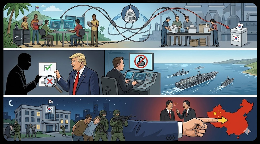 결론: 미국은 베네수엘라를 정리한 후, 부정선거의 근본 원인인 중국(왕후닝 세력)을 타격하여 시스템을 완전히 뿌리 뽑을 것임.
