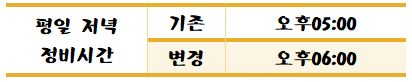 당센터 레인정비시간 변경 안내 작성자Vanessa(김희영)|작성시간25.12.02|조회수174 목록 댓글 0 글자크기 작게가 글자크기 크게가 12월 1일부로당센터 레인정비시간이 아래와 같이 변경되었음을 알립니다그외 정비시간은 변동사항 없습니다. 다음검색 현재 게시글 추가 기능 열기 북마크 공유하기 신고 센터로 신고 댓글 댓글 0 댓글쓰기 답글쓰기 댓글 리스트