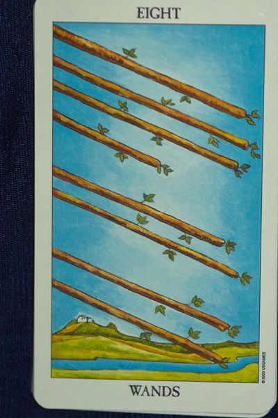 대부분의 카드에 이 에이트 완즈는 거의 동일한 이미지로 묘사되고 있습니다.