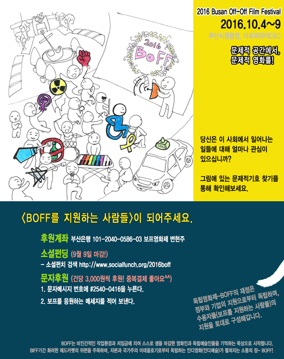 지난 2015년 10월, 부산국제영화제(Biff)에 쏠린 언론과 대중의 관심을 당시 부산시청 앞 고공농성장에서 생존을 걸고 농성 중이던 생탁, 택시 노동자들에게 돌리고자 했던 절박함으로 시작된 <부산오프오프영화제 (BOFF 보프)>. "문제적 공간에서, 문제적 영화를!"이라는 슬로건을 이어갑니다. 부산국제영화제 기간, 화려한 레드카펫의 뒤편을 주목합니다. <2016부산오프오프영화제>는 '파괴되는 공동체, 우리가 회복해야 할 공동체성'을 테마로 오는 10월 4일~9일, 부산시청광장과 아트씨어터C&C에서 열립니다. 시원하게 날릴 주먹 한방(boff)을 도모하는, BOFF의 독립을 위한 여러분의 십시일반 지원을 기다리고 있습니다. [보프를 지원하는 사람들]이 되어주세요. ^-^ ** BOFF를 지원하는 사람들 - 참여방법 ▶ 후원계좌 입금으로 지원하기 부산은행 101-2040-0586-03 (보프영화제 변현주) ▶ 소셜펀치 모금함으로 지원하기 http://www.socialfunch.org/2016boff = BOFF는 비인간적인 작업환경과 저임금에 치여 스스로 생을 마감한 영화인과 예술인들을 기억합니다. = |