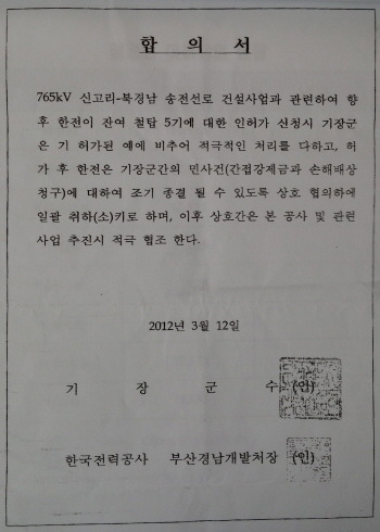 한전에서는 기장군으로부터 765kv노선 경유지선정위원회 위원추천을 받았다고 자신들의 정당성을 주정합니다