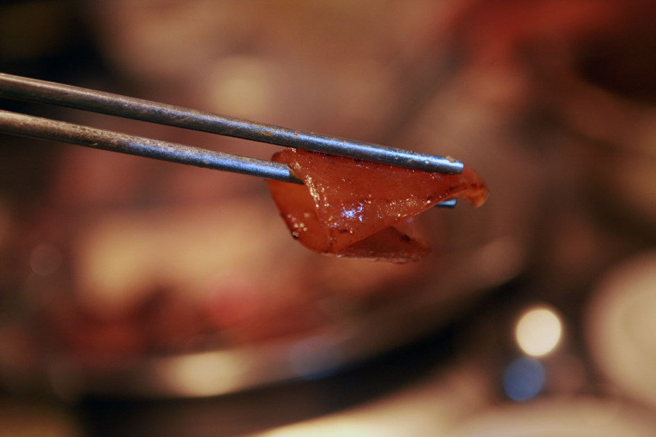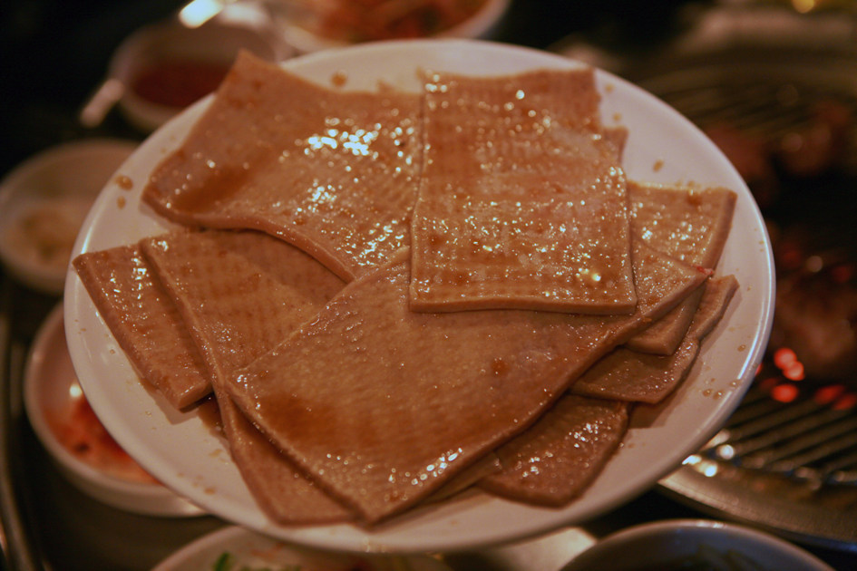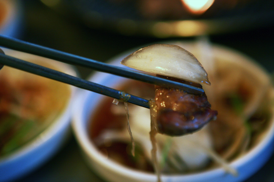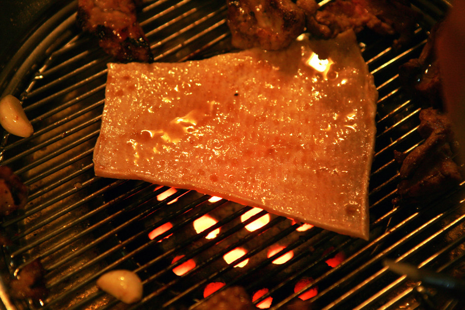 제 지인들은 돼지껍데기의 구워지는 모습을 보고 암수를 구별합니다. 저도 아직은 미숙하지만 어느정도는 구별할수 있을듯한데 이놈은 제가 배운것에 기초해보면 암놈인듯합니다. 두툼하지만 야들야들한게 무척 좋습니다.