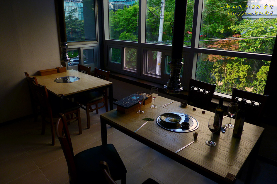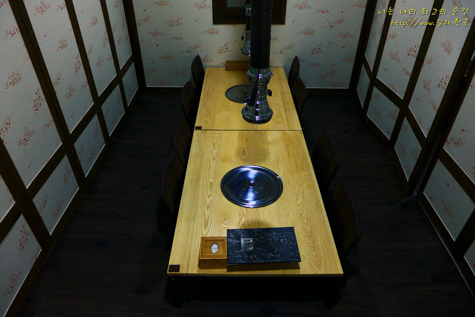 룸은 고기집이 아니라 마치 고급일식집처럼 꾸며져 있다. 칸막이를 열면 최대 32명까지 한방에 수용이 가능하다고 한다. 테이블은 원목으로 직접 만들었다고 한다.
