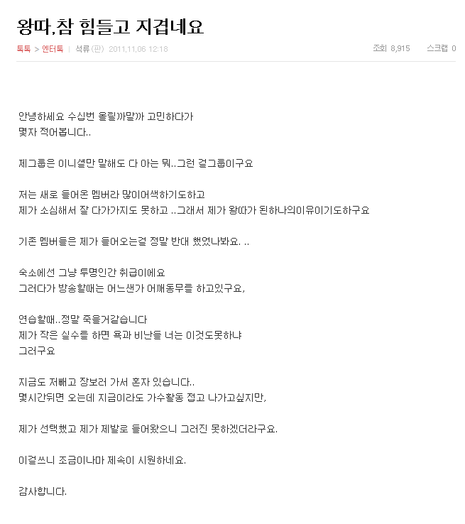 ?""""""""여러분의 댓글을 한개도 빠짐없이 다 읽었어요. 저도 모르게 눈물이 흐르는거 있죠? 바보도 아니고, 울보도 아닌데.. 그냥 눈물이 났어요.. 여러분이 달아주신 댓글로 인해 제 가슴속에 있던 답답한 것들이 눈물로 씻겨져 내려갔나봐요.. 항상 저에게 신경써주시고, 응원해 주셔서 얼마나 감사한지 몰라요. 이게 진짜 감동 이란거죠? 웃어야 정상인데 울기만 울고.. 창피하게.. 오늘 하루 여러분은 어떠셨나요? 전 평소와는 크게 다르지 않는 하루를 보냈답니다. 멤버들은 각자의 스케줄, 다른 그룹 멤버들과 약속등으로 인해서 숙소엔 저 혼자 있는데 전 이게 편해요. 그 누구의 눈치도 안봐도 되니깐.. 그리고 듣고 싶은 노래도 볼륨을 크게해서 들을 수 있어서 좋아요. 지금은 박효신 선배님의 "동경"과 "화신"을 듣고 있어요. 선배님의 목소리는 정말 뭐랄까.. 감미로워요. 달콤하고.. 이렇게 좋아하는 노래 들으며 시간보내는게 정말 편하고 좋아요. 꼭 눈을 감으면 뒤에서 누가 절 안아주는거 같은 포근함이 들어요. 제가 이상한건지.. "투비-루다" 노래도 들어보세요. 가끔 혼자 부르는 노래인데 참 좋아요. 아무래도 제 직업이 가수다보니 노래부르는것도 좋아하지만 듣는것도 정말 좋아한답니다. 그래서 항상 제 귀엔 MP3가 있어요. 아! 여러분의 댓글을 읽다보니 많은분들께서 카톡아이디나 연락처등을 댓글로 남겨놓는 분들도 계시더라고요. 당연히 연락드리는게 예의지만 여러분도 아시다시피.. 제가 그렇게 할 수 있는 처지가 아니란거.. 모두 이해해주실꺼죠? 저도 당연히 여러분과 카톡도하고 문자도하고 전화도하며 그렇게 지내고 싶은데.. 너무 죄송해요. 여러분 무시해서 그러는건 절대! 아니란 거 꼭 알아주세요. 그리고 저 요리는 잘 못하는데, 그래도! 멸치볶음이랑 된장찌개 잘해요. 김치도 조금 담글 줄 아는데 나중에 맛볼기회가 혹시라도 생긴다면 정성껏 해드릴께요. 저와 멤버들은 맨날 음식을 사먹진 못하고 모두 채소위주라.. 가끔 음식만들어서 먹기도 하는데 멤버들이 제가 만든 음식도 맛있게 먹어주면 참 좋을텐데.. 언젠간 멤버들이 환하게 웃으며 맛있게 먹어 줄 날이 올꺼라 전 믿어요. 절 싫어해도, 절 미워해도 그래도 가족이니까.. 여러분 저 힘낼께요! 많이 힘들어도 눈물나는것도 꾹 참고 열심히 활동할꺼예요. 많은 분들이 저에게 이렇게 응원해주시고 힘을 주시는데 포기하는건 정말 여러분의 기대를 져버리는거 잖아요. 여러분 말씀대로 항상 웃으며 활동할께요. 여러분, 제가 지금 제일 하고 싶은게 뭔지 아세요? 영화관가서 영화보고 까페가서 이야기하고 번화가에서 쇼핑도하고 그렇게 하루보내고 싶어요. 여러분은 시간나실때 쉽게 할 수 있는 일들이지만, 저는 그게 아니니까.. 가수란 직업을 선택하면서 다 포기하겠다는 각오로 뛰어들었지만 그래도 생각이 나는건 어쩔 수 없네요. 그래서 그런지.. 꿈에서 영화보는꿈을 꿔요. 하얀바탕의 꿈인데 커다란 화면앞에 제가 앉아있어요. 그 영화내용은 기억안나지만 혼자 꿈속에서 너무 즐거웠어요. 그런데 꿈에서 깨고 나면 많이 아쉬워요. 그런 여유는 꿈에서 밖에 느낄 수 없으니까.. 저 정말 바보같죠? 그거 아세요? 여러분이 TV에 나오는 연예인 부러워 하시는 것 처럼, 스케줄로 인한 장거리 이동이 많은 저는, 차안에서 여러분을 바라볼때 여러분의 그 "자유"가 전 너무 부럽답니다. 재미있죠? 이런것도 다 참아야지요. 기분이 너무 안좋을땐 저는 아끼던 향수를 몸에 뿌려봐요. 그 향이 제 몸을 휘어감아줄때.. 그때 묘하게 기분이 좋더라고요. 여러분도 집에 향수있으면 한번 해보세요. 또 정신없이 쓰다보니 글이 또 이렇게 길어져버렸네요. 여러분때문에 전 항상 큰 힘을 얻어요. 제가 누군지 밝힐 순 없지만.. 이 것 하나만 기억해줄래요? 여러분 때문에 하루하루 즐겁게 지낼 수 있는 큰 힘을 얻는 바보 같은 울보가수가 한명 있다는 걸.. 항상 감사하고.. 사랑합니다.