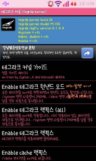 원낸드모드 패치후에 다시 테그라크 커널 어플을 실행해서