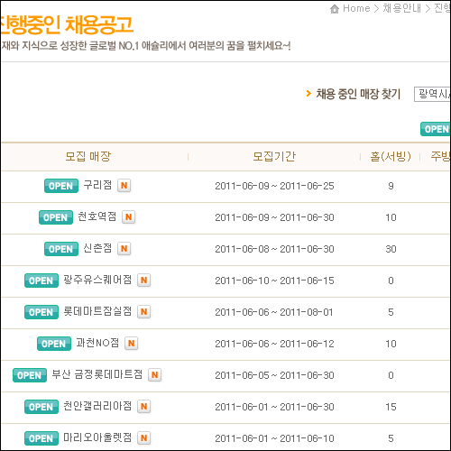 홈페이지에도 모집공고가 뜨고, 그 지역 알바몬이나 알바천국에도 공고가 뜨게 되요 ㅎㅎ