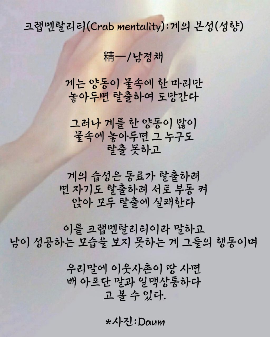 크랩멘탈리티(Crab mentality):게의 본성(성향)