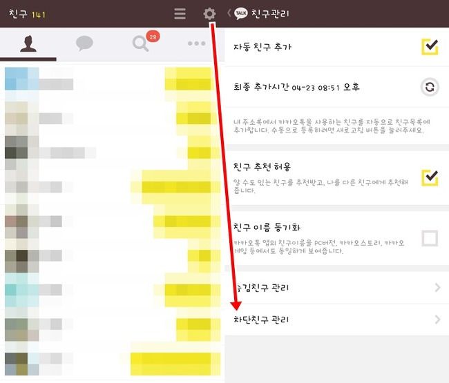 친구 리스트 상단의 톱니 바퀴 모양의 아이콘을 눌러 친구관리 화면으로 넘어 가기 바랍니다.