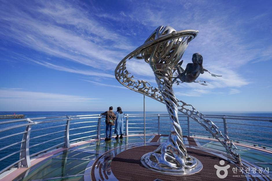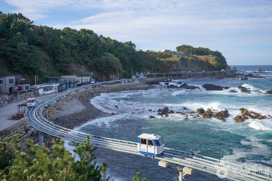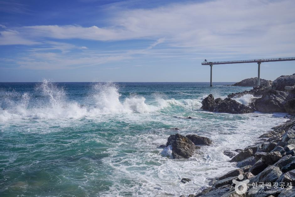 바다 위를 걸어 하늘 속으로, 울진 등기산스카이워크 울진의 다채로운 푸른색을 한 번에 감상할 수 있는 등기산스카이워크 푸른 바다와 푸른 숲, 푸른 하늘까지 울진의 매력은 온통 푸른색이다. 그러나 어느 것 하나 같은 푸른색이 없다. 같은 바다라도 날마다 푸른빛의 깊이가 다르다. 울진이 품은 다채로운 푸른색을 한 번에 즐길 수 있는 곳, 바로 등기산스카이워크다. 높이 20m로 멀리서도 존재감을 뽐내는 스카이워크 지난 2018년에 첫선을 보인 등기산스카이워크는 총 길이 135m로, 당시 국내 최장 스카이워크로 화제를 모았다. 그러나 지자체의 스카이워크 설치 경쟁이 치열해지면서 타이틀을 빼앗긴 지 오래다. 등기산스카이워크를 찾아가는 길, 멀리서 존재감을 뽐내는 구조물은 높이 20m로 우뚝 솟아 올려다보기만 해도 아찔하다. 해안선을 따라 걷다가 일부 구간이 바다를 향해 돌출한 여타 스카이워크와 달리, 시작부터 바다를 향해 쭉 뻗은 구조라 스릴은 배가 된다. 발아래 푸른 바다가 훤히 내려다보이는 강화유리 구간 등기산스카이워크는 바닥 오염을 방지하는 덧신을 신어야 입장이 가능하다(어린이 제외). 발아래가 훤히 내려다보이는 강화유리의 선명도를 유지하기 위해서다. 입구 목재 바닥을 지나면 길이 57m 강화유리 구간이 시작된다. 투명한 바닥으로 넘실거리는 파도가 그대로 비쳐 이 길이 바닷속으로 들어가는지, 하늘 위로 오르는지 헷갈릴 정도다. 스카이워크 너비도 2m 정도라 바닷바람이 고스란히 느껴진다. 풍속 9m/s 이상 강풍이 불면 입장을 제한하는 이유다. 눈부신 윤슬에 둘러싸인 후포 갓바위 스카이워크 중간쯤 이르면 후포 갓바위 안내판이 눈길을 끈다. ‘육지에 팔공산 갓바위가 있다면 바다에는 후포 갓바위가 있다. 한 가지 소원은 꼭 이뤄준다’는 설명이다. 오랜 세월 마을 사람들의 크고 작은 소원을 들어주던 바위는 한때 전망대와 정자까지 갖춘 번듯한 관광지였다. 바로 곁에 스카이워크가 들어서면서 오히려 본 모습을 찾은 것. 눈부신 윤슬에 둘러싸인 갓바위를 내려다보니 저 아름다운 바위처럼, 그저 나답게 살게 해달라는 바람이 일렁인다. 울진의 새 명물로 떠오른 등기산스카이워크 등기산스카이워크 끝자락에 신비로운 조형물이 눈길을 끈다. 의상대사를 사모한 선묘 낭자를 표현한 작품이다. 전설에 따르면 선묘는 사랑하는 남자를 위해 바다에 몸을 던져 용이 된다. 의상대사가 무사히 신라로 돌아갈 수 있도록 바닷길을 살피고, 위기에 처할 때마다 나타나 도움을 준다. 동해의 힘찬 물줄기 사이로 반은 용이고 반은 아름다운 여인의 모습인 선묘 낭자가 전설 속 한없이 자애로운 미소로 관람객을 맞이한다. 등기산스카이워크 운영 시간은 동절기(11~2월) 오전 9시부터 오후 5시까지(연중무휴), 입장료는 없다. 후포등기산(등대)공원으로 이어지는 구름다리 등기산스카이워크 출구는 구름다리(출렁다리)로 이어진다. 출렁이는 구름다리를 건너면 예부터 낮에는 깃발을 꽂아 위치를 알리고 밤에는 봉화로 뱃길을 안내했다고 이름 붙은 등기산이 모습을 드러낸다. 등기산(64m)은 나지막하지만, 뱃길을 지나는 이들에게 더없이 중요한 위치였다. 1968년 이곳 등기산에서 첫 불을 밝힌 후포등대는 불빛이 35km에 이른다. 울릉도와 제일 가까운 등대이기도 하다. 전망대로 활용하는 스코틀랜드의 벨록등대 모형 등기산에서 만나는 등대는 후포등대뿐만 아니다. 후포등기산(등대)공원에 세계 각국의 대표적인 등대를 모형으로 제작·설치했다. 1611년에 세워 프랑스에서 가장 오래된 등대이자 유네스코 세계유산으로 등재된 코르두앙, 세계 최초의 등대로 알려진 이집트 파로스, 중세 고딕 교회가 떠오르는 붉은 벽돌이 인상적인 독일의 브레머하펜, 악명 높은 암초에서 뱃길을 밝히는 별로 다시 태어난 스코틀랜드의 벨록 등을 한자리에서 만난다. 전망대로 활용하는 벨록등대에 올라 탁 트인 울진 앞바다를 눈에 담아보자. 등기산에서 발굴된 집단 매장 유적과 선사시대 생활 모습을 전시한 울진후포리신석기유적관 공원 한쪽에 울진후포리신석기유적관이 자리한다. 1983년 등기산 꼭대기에서 집단 매장 유적이 발견됐는데, 지름 4m 안팎 자연 구덩이에서 40명이 넘는 사람 뼈가 출토됐다. 부장된 토기는 한 점도 없었으나, 돌도끼 180여 점이 발굴됐다고. 이 돌도끼는 장례 시 사람 뼈를 덮는 용도였는데, 이처럼 장례용으로 추정되는 돌도끼가 발굴된 사례는 드물다고 한다. 유적관 내부는 유적 발굴 과정과 신석기 생활 모습을 복원한 공간으로 만들었다. 아기자기한 풍경이 걷는 재미를 더하는 후포리벽화마을 등기산스카이워크가 들어선 후포리는 인기 예능 프로그램 〈백년손님〉에 나오면서 전국적으로 유명해졌다. 덕분에 이를 주제로 벽화마을도 꾸몄다. 순박하면서도 유쾌한 입담으로 시청자에게 사랑받은 후포리 어르신들이 그림 속 주인공이다. 앞서 이곳에서 촬영한 드라마 〈그대 그리고 나〉, 누군가의 추억 속에 남았을 따스한 고향 풍경이 낡은 담벼락을 가득 채운다. ‘하트 해변’을 지나는 죽변해안스카이레일 요즘 울진에서 가장 ‘핫한’ 즐길 거리를 꼽으라면 