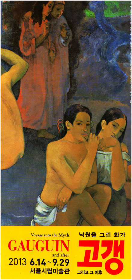 낙원을 그린 화가 고갱 작품 ♬ 타이스의 명상곡/마스네 전시장 내의 작품에 사진촬영이 엄격히 금지돼 있어 엽서와 카드 및 작품해설집을 스캔하여 포토샵으로 보정한 것임. 그의 유명한 작품인 <우리는 어디서 왔는가, 우리는 무엇인가, 우리는 어디로 가는가>는 제목부터 사색적이고 철학적이며 작품 내용도 이를 잘 표현한 것이어서 배경음악도 명상곡으로 설정하였다. 한글판 작품해설 책자는 품절이어서 영문판으로 구입하여 작품명을 영문 그대로 표기하였다. 관람객으로 엄청 북적거려 또다른 분위기에서 놀랐다.3개월반 동안 내내 이런 성황이었을까 미술에 대한 관심을 갖는 사람이 많다는 것은 우리도 선진국으로 가기 위한 문화수준을 가늠할 수 있다는 점에서 좋은 현상일 것이다. 교향악 연주회에도 가 본 지가 수 년이 됐으니 문화인으로 부끄럽던 차에 차일피일 미루다 막바지 마감일 가까워서야 관람하게 되어 비문화인 비교양인에서 최소한 면피한 기분이었다. 입장권은 1만3천원이나 국가***증을 제시하여 무료입장. 고갱(Eugéne Henri Paul Gauguin1848 ~ 1903) 고갱의 '황색그리스도가 있는 자화상' (1890~91년) 프랑스의 화가. 부친은 신문 편집장, 모친은 페루 혈통. 파리에서 출생. 은행원이 된 후, 여가 있을 때마다 회화에 전심, 살롱 전에 입선했다. 피사로를 알게 되어 인상파의 영향을 받은 후, 1880년의 제5회 인상파전에 참가, 화가 생활을 했다. 1886년부터 인상파의 회화에 만족치 않고 독자적인 화풍을 창시, 평면적인 채색으로 장식적인 그림을 그리면서 그의 화풍을 따르는 젊은 화가들과 퐁타방(Pont-Aven)파를 창립했다. 1888년 남불(南佛) 아를(Arles)에서 고흐와 함께 생활하다가, 고흐의 발광으로 결별하고 1891년 문명 사회에 대하여 염증을 느끼는 동시, 원시적 자연을 동경하여 동남 태평양의 타히티(Tahiti) 섬을 방문, 원시적인 생활을 하면서 《3인의 타히티 인》 등 우수품을 제작했다. 세잔ㆍ고흐 등과 함께 후기 인상파의 한 사람으로 세잔은 객관적 또는 공간적인 것을 취재하고, 고흐는 주관적인 것을 제재로 했으나, 고갱은 장식적인 것의 부활을 주로했다. 그의 강렬하고도 새로운 장식풍의 화풍은 후세 회화에 많은 영향을 주었다. The Ancestors of Tehamana OR Tehamana Has Many Parents (Merahi metua no Tehamana), 1893 Two Tahitan Woman, 1899 * 이 작품은 전시되지 않았으나 유명한 작품이라 인터넷에서 채집한 것임 The Yellow Christ, 1889 Where Do We Come From? What Are We? Where Are We Going 우리는 어디서 와서 우리는 무엇이며 어디로 가는가 Te tamari no atua(The Child of god ), 1896 Vision of the Sermon(Jacob Wrestling with the Angel) 1888 Still Life, Vase of Flowers at the Window, 1880 Manao tupau(The Spirit of the dead Watching) 1892 Te arii vahine(The Noble Woman),1896 Landscape with Two Breton Woman, 1889 Nave Nave mahana(Delightful Day),1896 Self-Portrait with Yellow Christ, 1890-91 황색그리스도가 있는 자화상 '우리는 어디서 왔는가, 우리는 무엇인가, 우리는 어디로 가는가' 캔버스에 유화, 139.1.2x374.6㎝, 1897~1898년 제작, 보스턴 미술관 소장 고갱의 작품 가운데 가장 기념비적인 이 작품은 무척이나 독특한 분위기를 띠고 있다. 화려한 채색이 주를 이루는 폴리네시아 시기의 작품들과 달리, 푸른색이 지배적인 이 작품에서는 아득한 깊이가 느껴진다. 오른쪽 하단의 자고 있는 어린 아기에서 시작해 왼쪽 죽음을 맞이하는 늙은 여인으로 끝나는 이 작품은 인생의 깊이를 새삼 깨닫게 해준다. 제목이 의미하는 바를 단적으로 말하자면, 젊음이나 아름다움은 금새 지나가고 머지않아 모든 이에게 죽음이 찾아온다는 점이다. 한쪽으로 고개가 돌아간 채 깊이 잠자고 있는 아기에게서는 편안함보다는 긴장감이 느껴지는데 원죄를 짊어지고 태어난 인간의 고난을 시사하고 있다. 어둠 속에서 붉은 빛이 감도는 보라색 옷을 입고 걸어 나오는 두 인물은 선악과를 먹은 후의 인간의 상태를 나타내고 있다. 작품 중앙에는 양손을 위로 올려 열매를 따려는 인물이 있다. 열매를 따는 모티브는 에덴동산에서의 추방이라는 주제를 연상시킨다. 왼쪽 하단에 그려진 늙은 여인은 어둡고 침울해 보이는데, 눈동자에선 삶에 대한 강한 의지가 엿보인다. 왼편에는 또 푸른색으로 채색된 우상이 보이는데 바로 사후세계의 여신 히나를 표현한 것이다. 인간의 탄생과 죽음, 그리고 사후 세계로 삶이 순환하고 있다는 점을 이 대작을 통해 표현하고 있다.-서울경제 2013.9.16 * 투박한 삼베에 그렸다고 하는데 폭이 무려 4m가까운 대형 그림이다. 고갱 더 알아보기 1848년 6월 7일 프랑스 파리에서 출생하였다. 그의 아버지 클로비 고갱은 《르 나시오날》이라는 신문의 정치부 기자였다. 1848년 2월 프랑스혁명이 일어나 공화정이 되면서 프랑스는 정치적 혼란기를 겪게 된다. 클로비 고갱은 이때 페루의 수도인 리마로 이주해서 신문사를 차리기로 계획하고 가족을 데리고 페루로 이주한다. 하지만 그의 아버지는 페루로 가는 여객선에서 심장병으로 사망한다. 폴 고갱의 어린 시절은 이렇게 페루 리마에서 불행하게 시작되었다. 그가 리마에서 보낸 시기는 1849~1854년까지 였으며 리마에서 생활은 어려움의 연속이었다. 1854년 고갱의 가족은 