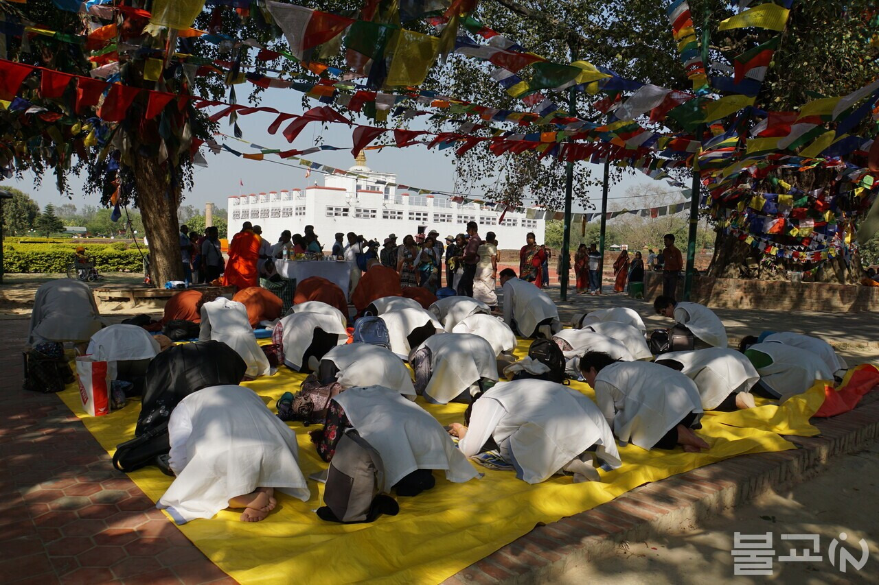 부처님 탄생지 마야데비 사원을 향해 108배를 하고 있는 한국 불자들.