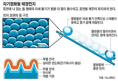 연잎에는 미세한 돌기들이 나있어 물방울이 스며들지 못하고 굴러 떨어진다. 이때 먼지도 함께 쓸려가 연잎은 항상 깨끗한 상태를 유지할 수 있다. 같은 원리로 태양전지 표면을 항상 깨끗한 상태로 유지, 빛에너지를 전기로 바꾸는 효율도 높이는 기술이 개발됐다.햇빛이 태양전지에 닿으면 35%가 전기를 만드는 데 쓰이지 못하고 바로 반사된다. 연구진은 태양전지 표면에 폭 100㎚(나노미터, 1㎚는 10억분의 1m)의 돔 구조를 450nm 간격으로 만들었다. 비결정 태양전지는 파장이 400~800㎚인 빛을 이용한다. 폭이 그보다 작은 돔은 광섬유처럼 빛을 인도하는 도파관(導波管) 역할을 해 햇빛이 반사되지 않고 태양전지 내부에 머무르게 한다.