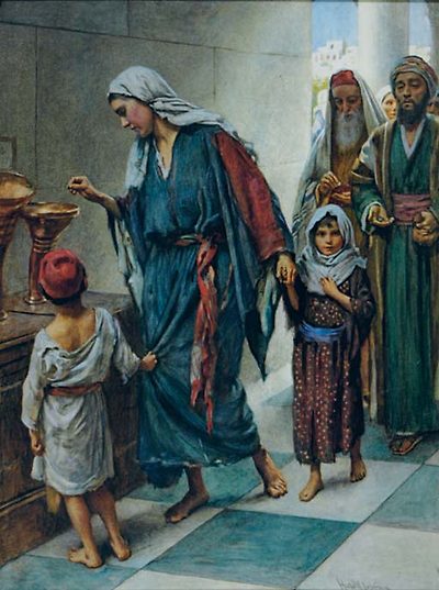 A young woman giving alms to the church