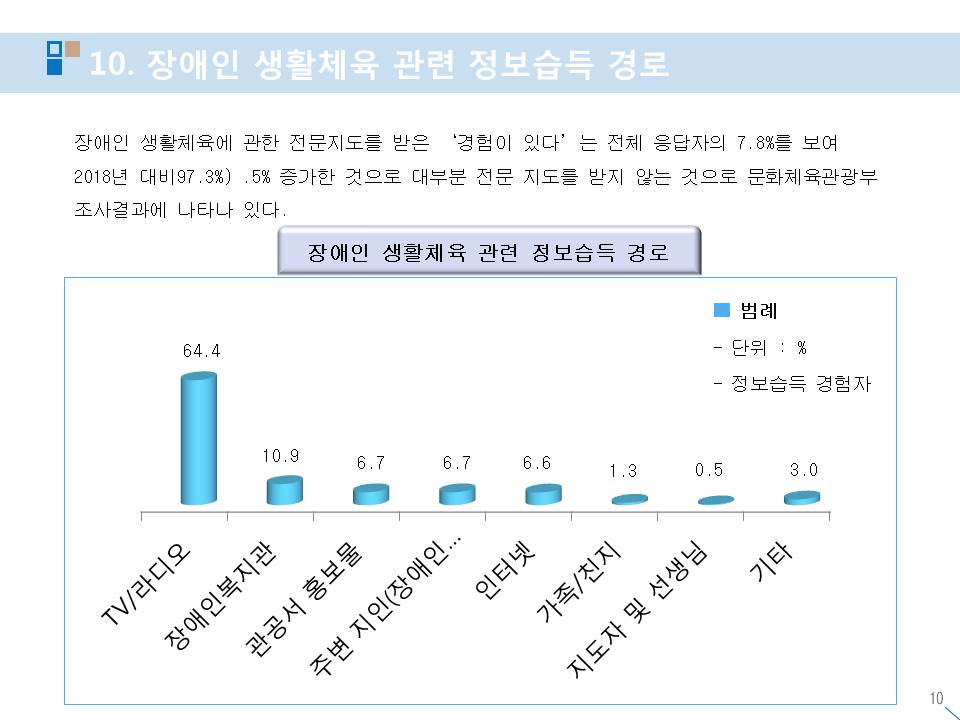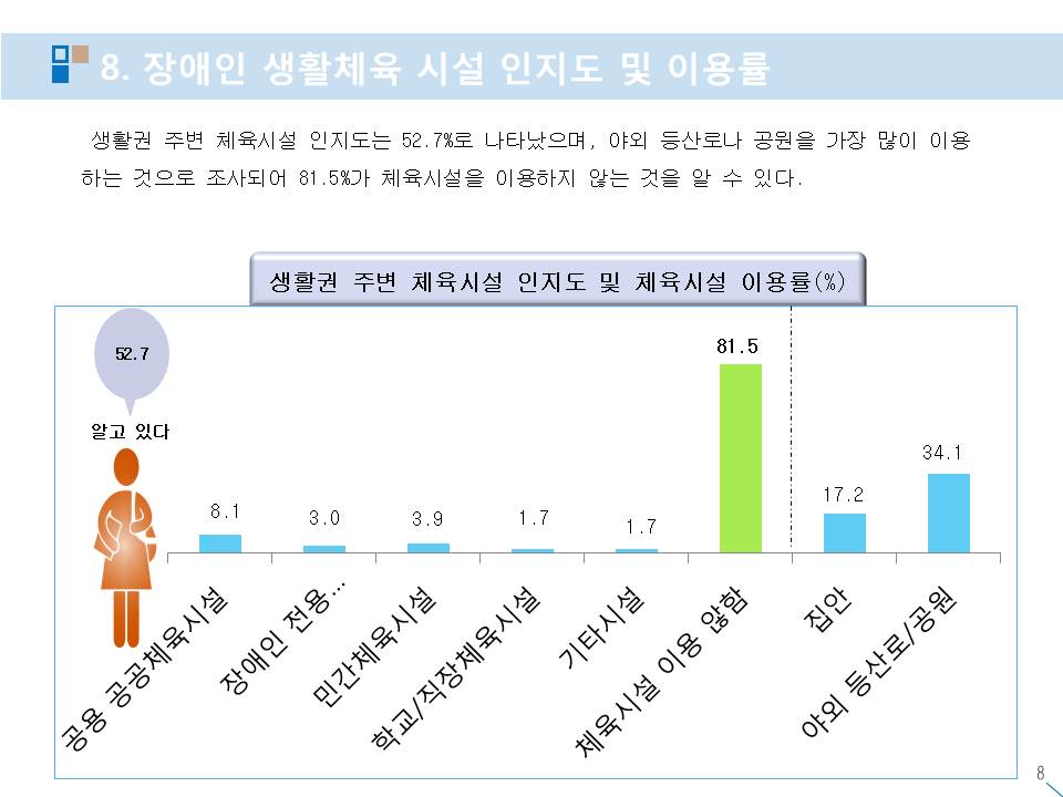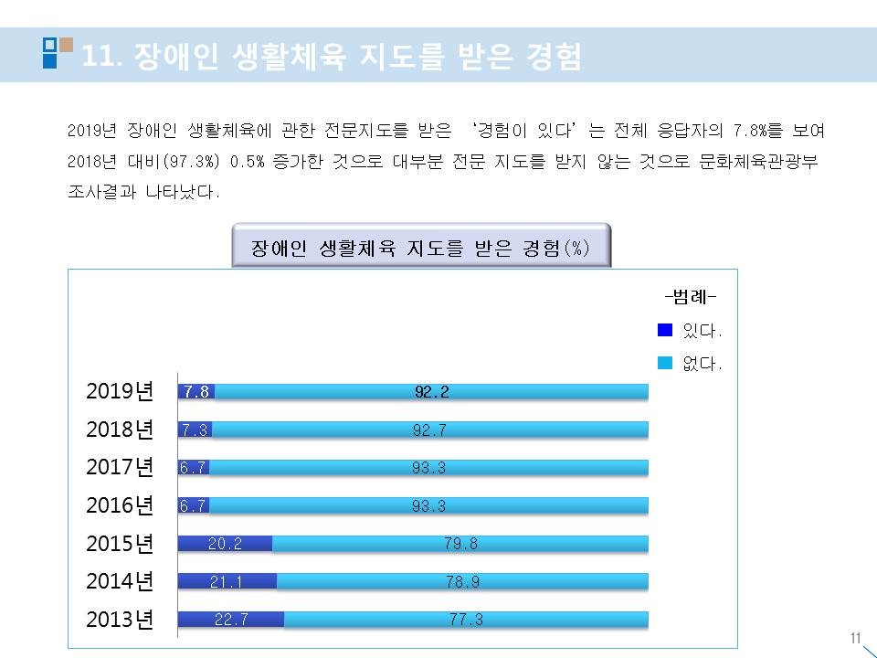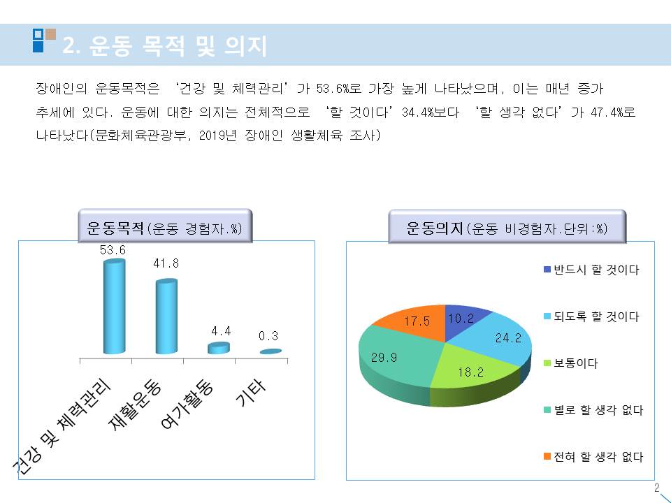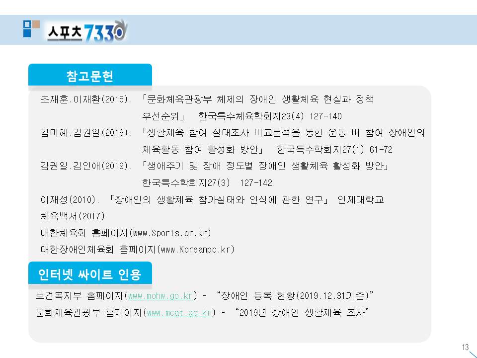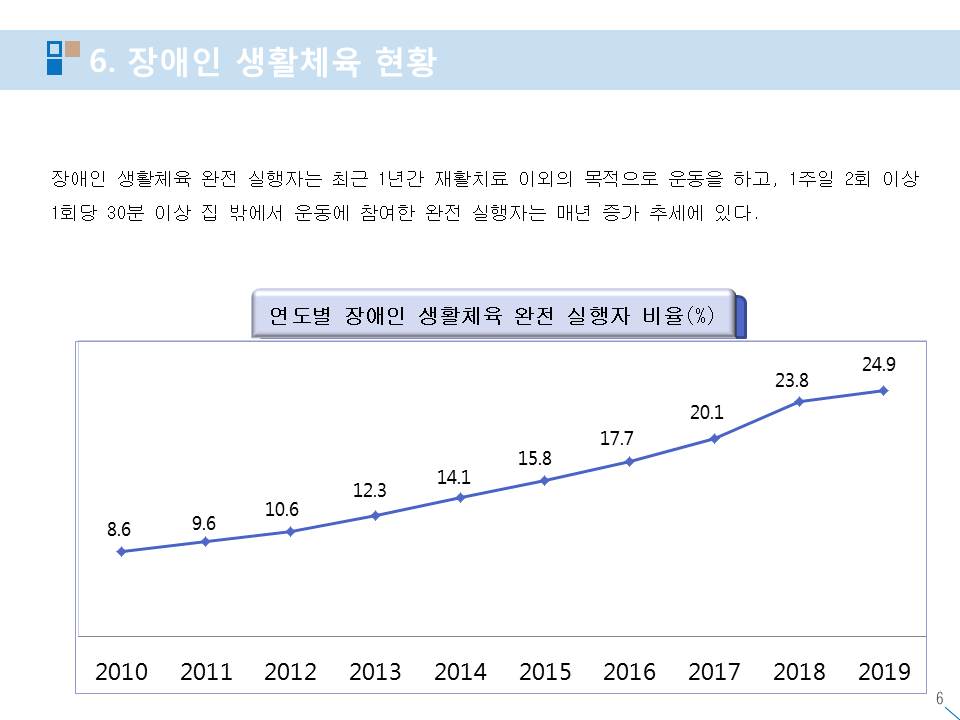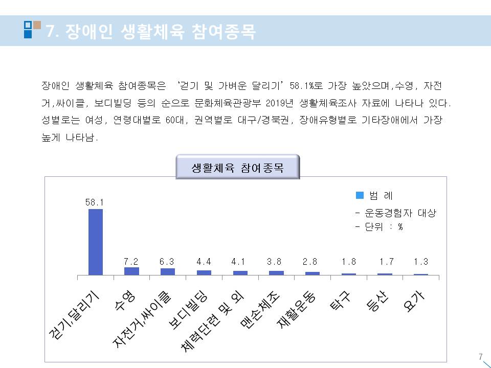 장애인 생활체육 참여율 실태 현황 작성자스포피아협동조합|작성시간20.12.05|조회수51 목록 댓글 0 글자크기 작게가 글자크기 크게가 다음검색 현재 게시글 추가 기능 열기 북마크 공유하기 신고 센터로 신고 댓글 댓글 0 댓글쓰기 답글쓰기 댓글 리스트