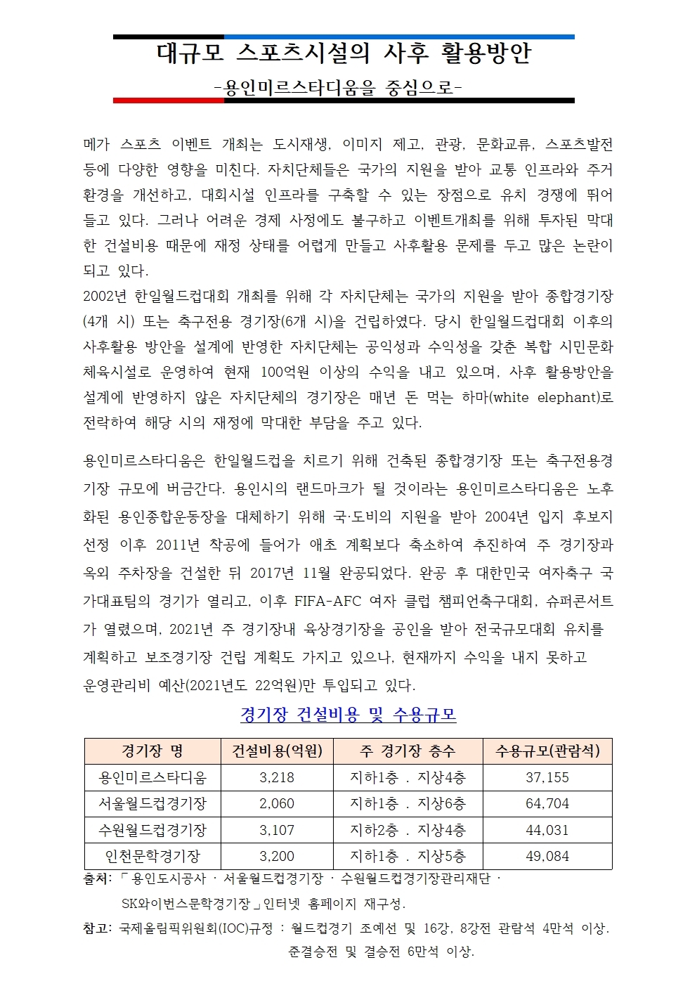 대규모 스포츠시설의 사후 활용방안 작성자스포피아협동조합|작성시간21.01.22|조회수48 목록 댓글 0 글자크기 작게가 글자크기 크게가 다음검색 현재 게시글 추가 기능 열기 북마크 공유하기 신고 센터로 신고 댓글 댓글 0 댓글쓰기 답글쓰기 댓글 리스트