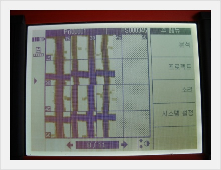 < 측정후의 디스플레이 화면 -철근간격 및 배근상태 / 피복두께 / 철근지름 >