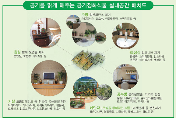 거실에 좋은 식물 거실은 온 가족이 모여 사용하는 주요 활동 공간이다. 따라서 그 어떤 공간보다 공기정화 기능이 뛰어나야 하며, 공간도 넓기 때문에 식물의 크기도 1m 이상 되는 큰 것을 선택해 배치하는 것이 중요하다. ▶ 거실에 좋은 공기정화 식물로는 아레카야자, 인도고무나무, 드라세나, 디펜바키아 등이 있다.  실내정원용 공기청정기는 공기정화식물로 만든 실내정원과 공기청정기 기능을 플라워박스 안에 넣어 공기를 순환하도록 만든 제품으로 인테리어 효과까지도 준다. 베란다에 좋은 식물 베란다에는 휘발성유해물질(VOC) 제거 능력이 우수한 식물 중에서 특히 햇볕을 많이 필요로 하는 식물을 고르는 것이 좋다. 꽃이 피는 식물이나 허브류, 자생식물 등을 적절히 배치하는 것이 좋다. ▶ 베란다에 좋은 식물로는 팔손이나무, 국화(분화), 시클라멘, 꽃베고니아, 허브류 등이 있다.  햇볕과 추운 온도에도 비교적 잘 견디며 잎의 면적이 커 공기정화 효과가 큰 팔손이나무. 베란다나 거실 등에 두고 키우면 잘 자란다.