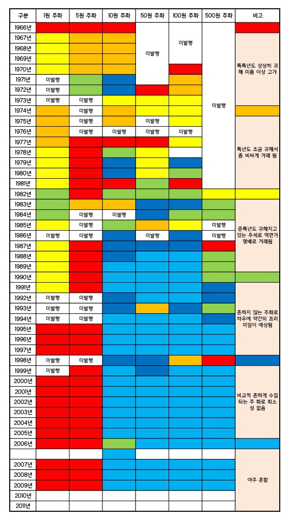 먼저 알아보기 쉽게 하기 위해서 1원에서 500원까지의 주화 희귀도표부터 올려드리도록 할게요, 밑에 1원~500원 년도별로 희귀도표에 따른 색을 칠한 것을 올릴텐데요, A가 가장 희귀한 년도로 보통 액면 30배 이상은 물론이며 1원주화는 액면 3000배, 5원 주화는 1000배 이상응로 거래된다고 하네요. 색상은 A에서 F까지 빨주노초파남 이 순서로 해놓아서 더 알아보기 쉬울 것 같습니다. 먼저 동전 1원 희귀년도 표예요. 아무래도 1원은 요즘은 거래되지 않는만큼 대부분 희귀년도로 분리되는데요,특히나 1996년도와 1원이 발행되지 않은 1998년도 1999년도를 제외한 1995년도부터 2013년도까지의 1원 동전이 A급으로 상당히 희귀하다고 하네요. 근데 생각해보면 1원짜리는 3000배해도 3,000원밖에 되지 않는지라...^^; 다음은 10원 동전 희귀년도 표를 봐볼까요? 10원 동전은 1966년도와 1977년도, 1982년도가 특히 희귀하다고 하며, 1970년도 황동과 1973년도도 귀한편에 속한다고 합니다. 아무래도 최신에 발행된 동전일수록 매우 흔해지네요. 다음은 50원 동전 희귀년도 표입니다. 50원 동전은 대부분 흔하게 거래되고 있는 것 같은데요, 1972년부터 1980년도까지나, 1985년도, 1993년도 50원 동전의 경우 보다 높은 가격으로 거래될 수도 있을 것 같네요. 가장 많이 쓰인다고 생각하는 100원 동전의 희귀년도표입니다. 100원동전의 경우엔 1970년도와 1981년도 동전이 특히나 귀하다고 하구요, 이외에 1971년도에서 1977년도까지나 1985년도, 1998년도 100원짜리도 귀한편이라고 합니다. 마지막으로 500원 동전! 500원 동전이 가장 희귀한 년도가 별로 없는 것 같네요. 일단 1987년도와 1998년도 500원 동전이 희귀하다고 하구요, 1982년도 동전도 귀해지고 있는 추세라고 합니다. 이외에는 거의 다 비교적 쉽게 수집이 가능한 년도의 동전들이라고 하네요,. 현용주화 경매 낙찰가를 들어보니 1998년도 500원은 1,030,000원에 낙찰되었었다고 하구요, 1970년도 10원은 각각 560,000원, 460,000원, 1969년도 10원은 510,000원, 1966년 10원은 400,000원, 1975년 10원은 350,000원에 낙찰되었다고 합니다. 10원짜리의 희귀동전도 그렇지만 500원짜리는 희귀년도의 경우 가격이 진짜 장난아니네요. 103만원이라니... 500원의 2000배가 넘는 금액입니다. 이 정도로 귀한 동전인 만큼, 모두 무심코 썼다가는 안타까울 것 같은데요, 다들 요것 보시면 집에 있는 동전들 탈탈