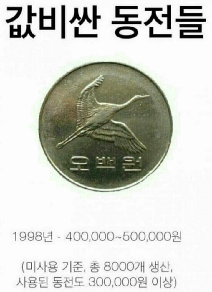 마지막으로 가장 비싼 500원짜리 희귀동전입니다. 아시겠지만 500원 짜리중에 1998년도는 8000개 밖에 발행이 되지 않아 경매에서 최대 100만원이 넘는가격에도 팔렸다고 하니 엄청나죠?? 앞으로 동전들을 유심히 보고 사용해야겠어요!! 사실.... 저도 좀 있어요~~ㅎㅎㅎㅎ