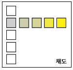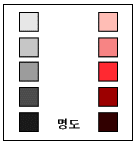 - 고명도 : 명도가 높은 색을 말한다. 흰색에 가까울수록 고명도이다. - 저명도 : 명도가 낮은 색을 말한다. 검정색에 가까울수록 저명도이다. - 중명도 : 고명도와 저명도의 중간 단계를 말한다. - 그레이스케일 : 검은색과 흰색 사이의 단계를 나누어 놓은 것을 말한다. 우리나라는 검은색을 '0'으로 흰색 을 '10'으로 두고 11단계로 나눈다. 그러나 실제의 색입체에서는 순수한 검정 과 백색광의 흰색은 없다. 그러므로 검정 대신 가장 어두운 회색을 1로, 가장 밝은 흰색에 가까운 9.5를 흰색 대신 사용한다. 그레이 스케일(GreyScale)은 명도의 기준 척도로 색이 표준은 물론 사진, 인쇄, TV 등에서 이용되고 있다 ■ 채도(Chroma) 채도란 색의 선명도를 말한다.색의 순수한 정도, 즉 색의 탁하고 선명한 강약의 정도를 나타내는 척도이며, 색파장이 얼마나 강하고 약한가를 느끼는 것이 채도이다. 포화도. 그러므로 채도가 가장 높은 색을 청색(Clear color)이라 한다. 즉, 색의 말고 탁한 정도나 색의 강약이라고 할 수 있다. 순색에 무채색을 많이 섞을수록 채도가 낮아지며 적게 섞을수록 채도가 높아진다. 유채색끼리도 많이 섞을수록 채도가 낮아진다.