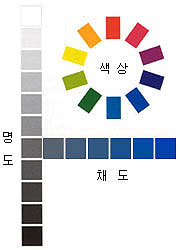 우리가 색채를 보고 느끼는 요인에는 세 가지가 있다. 그 하나는 빛의 파장 자체를 나타내는것으로 색상(Hue) 요인이고, 두번째는 밝고 어두운 정도를 나타내는 명도(value), 세 번째는 색파장의 순수한 정도를 나타내는 채도(Chroma)요인이다. 우리는 어떤 색상을 지각할 때 항상 이 세 가지 요인을 함께 느낀다. ■ 색상(Hue) 색상의 명도나 채도는 상관없이 색채를 구별하는 데 필요한 색의 명칭을 말한다. 색상은 물체의 표면에서 선택적으로 반사되는 색파장의 종류에 의해 결정되며 빨강, 주황, 노랑, 초록, 파랑, 보라 등으로 구분된다. 색상은 순수한 색일수록 현저하게 드러나므로 지각하기가 쉽다. 그러나 여러 가지 색이 혼합 된 경우에는 색상이 강하게 드러나지 않아 지각하기가 쉽지 않지만, 무채색인 흰색, 검정색, 회색을 제외한 모든 색은 순색이 지닌 색상을 조금이라도 지니고 있다.