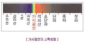 ■ 빛 망막을 자극함으로서 감지되는 방사의 시각적 양상, 망막을 자극하여 시각점을 일으킬 수 있는 방사, 이 방사의 파장 범위는 실용상 380nm~780nm까지로 이 범위를 가시광선이라고 한다. 780nm 이상은 열선으로 적외선과 라디오에 사용되는 전파이다. 380nm 이하는 주로 병원에서 사용되는 자외선과 x선이다.