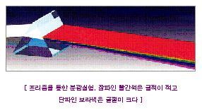 ■ 스펙트럼(1666년 뉴튼이 발견) : 빛을 프리즘에 투과시키면 가시광선들이 파장의 길이에 따라 굴절하는 각도가 다른 성질을 이용하여 무지개 색과 같은 연속된 색띠가 형성 된다.
